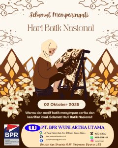 MEMPERINGATI HARI BATIK NASIONAL Posted on October 2, 2025October 2, 2025 by bprwuni SELAMAT MEMPERINGATI HARI BATIK NASIONAL Warna dan Motif Batik menyimpan cerita dan kearifan lokal.. Posted in Uncategorized.